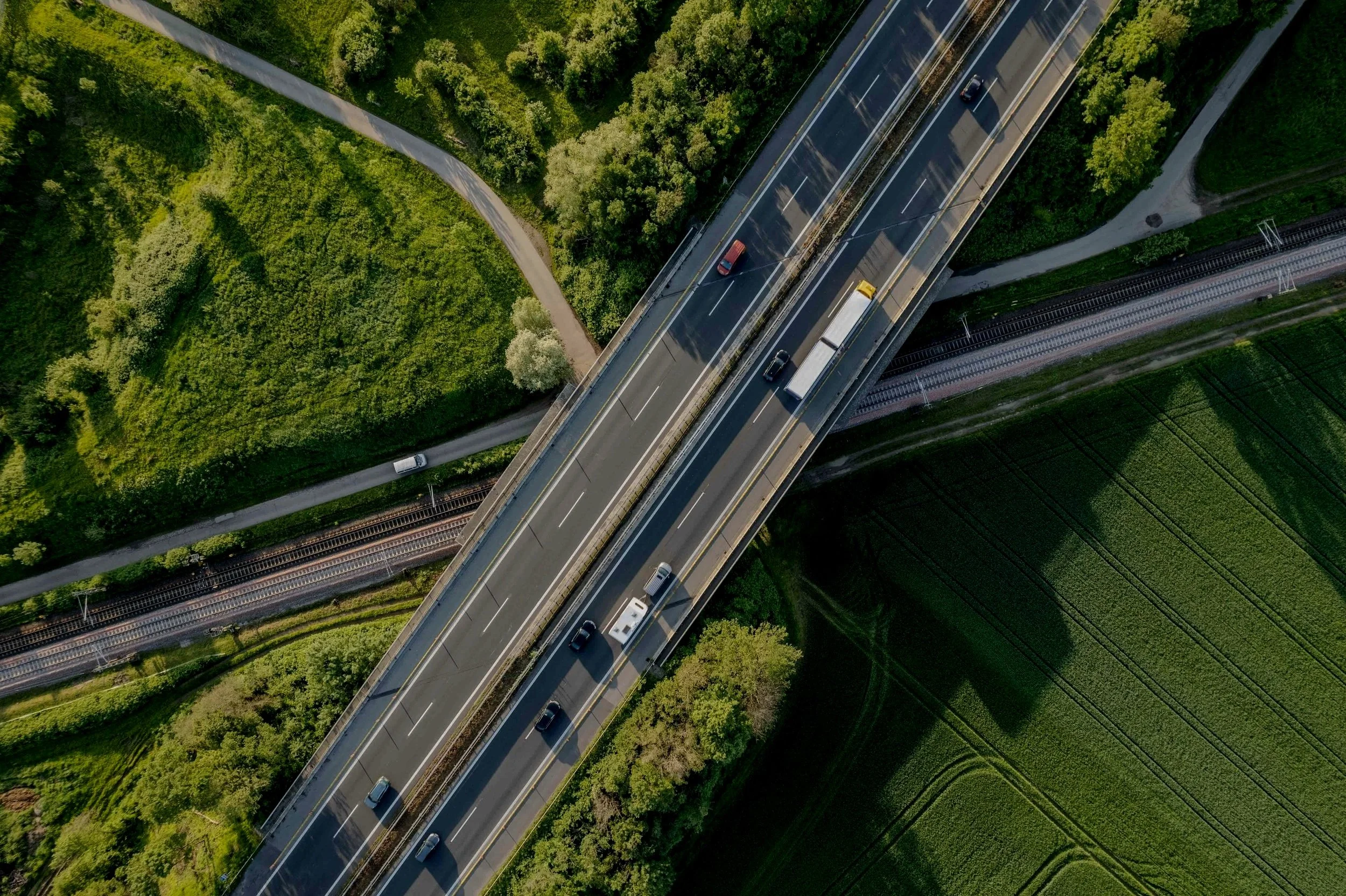 Luftaufnahme einer Bahnstrecke, umgeben von grünen Feldern und Bäumen, mit einem gelben Wartungstriebwagen auf den Schienen.